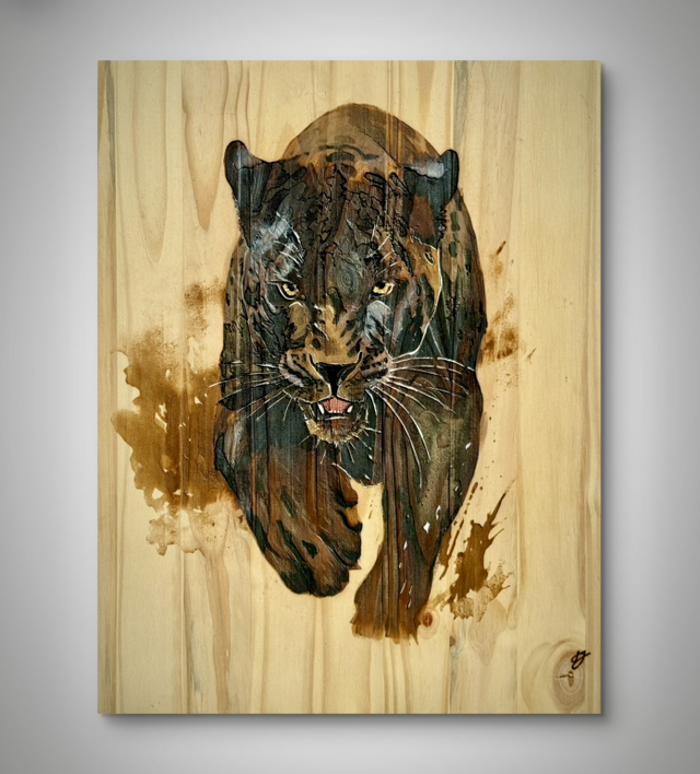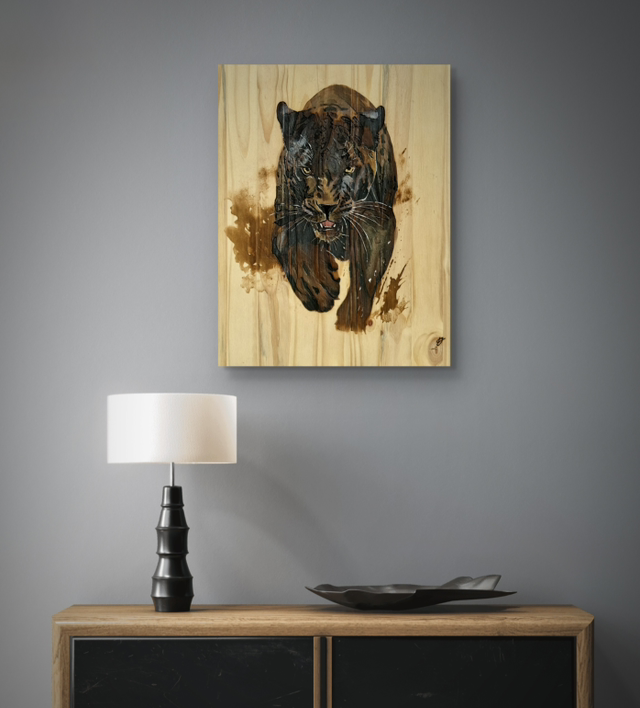 Découvrez ce tableau unique représentant La Panthère noire, sauvage et indomptable… Prête à marquer son territoire.