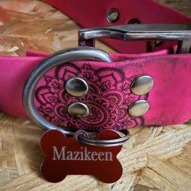 En aluminium coloré, légère et ultra résistante, elle est personnalisable avec le nom de votre chien + téléphone. ( à préciser lors de la commande) graver au laser.